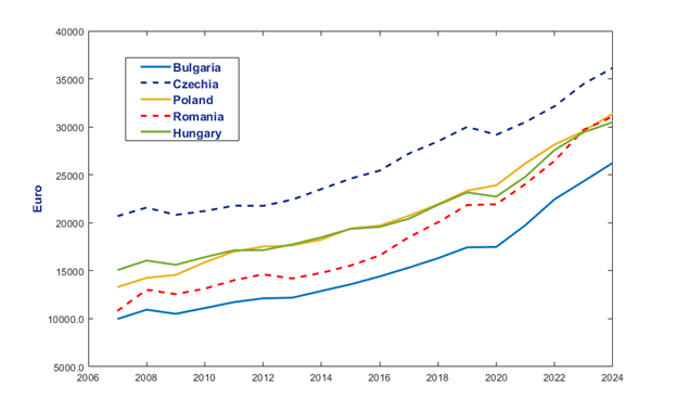 For Central and Eastern Europe, the developments presented in Figure 4 highlight the fact that Romania had one of the fastest and most sustained GDP per capita dynamics in the region. At the time of accession to the European Union, our country ranked above only Bulgaria. At the same time, Hungary’s GDP per capita was higher than that of Romania and Poland. About 18 years later, in 2024, Romania’s GDP per capita was very close to that of Poland and higher than that of Hungary.