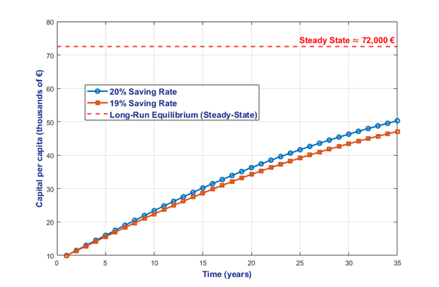 Thus, we considered two emerging economies, where the level of capital per capita is 5000 euros, the rate of capital depreciation is 5% per year, while the share of capital in the total income of the economy is 30%. The two economies differ only marginally, through savings rates of 20% and 19%, respectively. The results presented in Figure 7 indicate that, after a 15-year interval, the difference between the two economies in terms of capital per capita begins to increase. At the end of the 35-year horizon, the economy characterized by a slightly higher saving rate registers a level of capital per capita approximately 6.8% higher than the other.