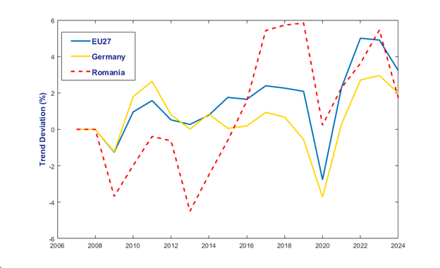 Looking back, as has often been pointed out and as I have mentioned on other occasions, since the moment of integration into the European Union until now, the data highlight remarkable progress for Romania in terms of real convergence. Gross domestic product per capita, expressed in purchasing power parity, increased from around 10,800 euros in 2007 to around 31,000 euros in 2024 – a tripling in 17 years. We chose this measure expressed in PPS because it more accurately reflects the real purchasing power of the population, allowing for meaningful comparisons with other EU Member States, regardless of differences in prices and living costs. As shown in Figure 2, the trajectory of GDP per capita in Germany aligns closely with the broader trend across the European Union.