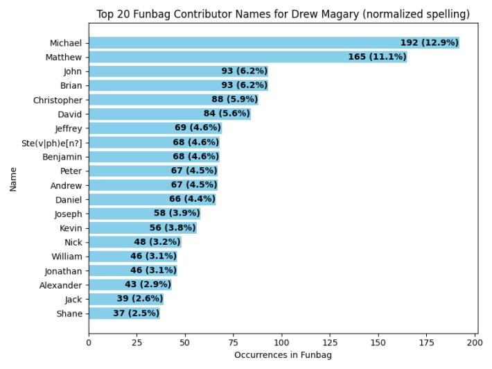 Tasked with picking up a new programming language for a work project, I practiced by writing a script that determined the most common Funbag question contributor names. It scraped all 255 Funbag posts, counted up all occurrences of the names (accounting for variations in various name spellings such as Steve/Steven/Stephen), and broke everything down by the byline for that week’s Funbag.