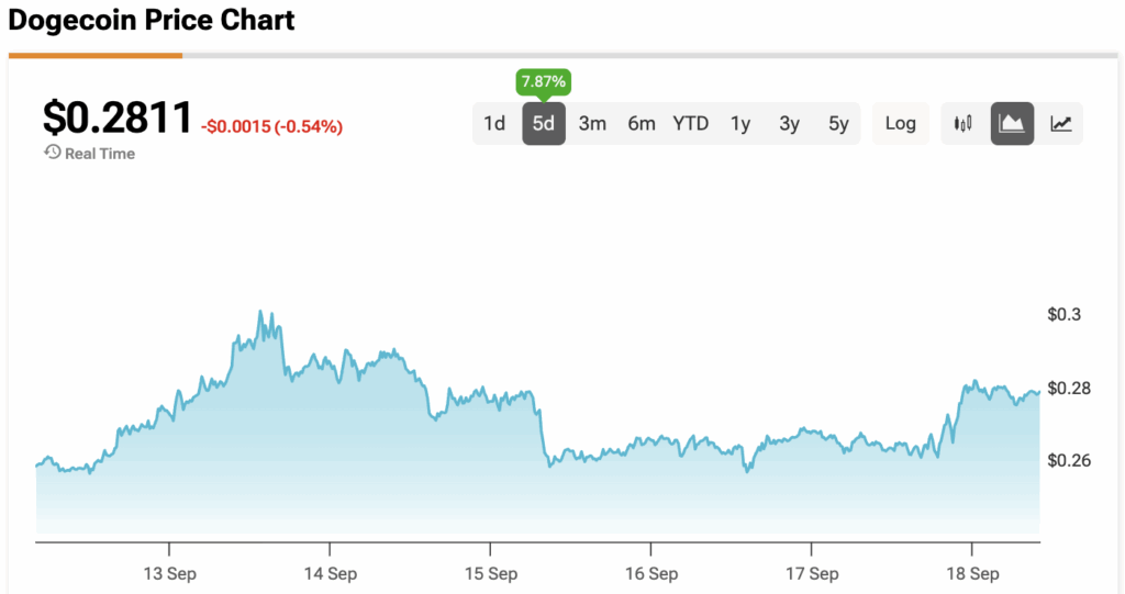 At the time of writing, Dogecoin is sitting at $0.2811.