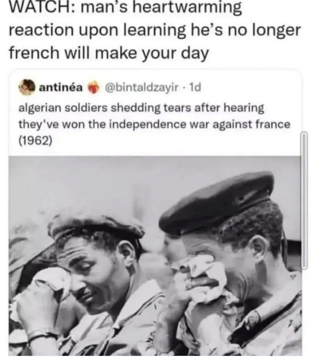 Fun fact they actually didn’t won. De Gaulle just said “Too much muslims reproducing like rabbits time to abort French Algeria” Fln then treated algerians worse than France. Algeria in 62 had the same gdp as South Korea. And they should still have 1 similar gdp with how much oil and gas they have. But african government must african government so no education, no infrastructures, authoritarian regime, embezzlement