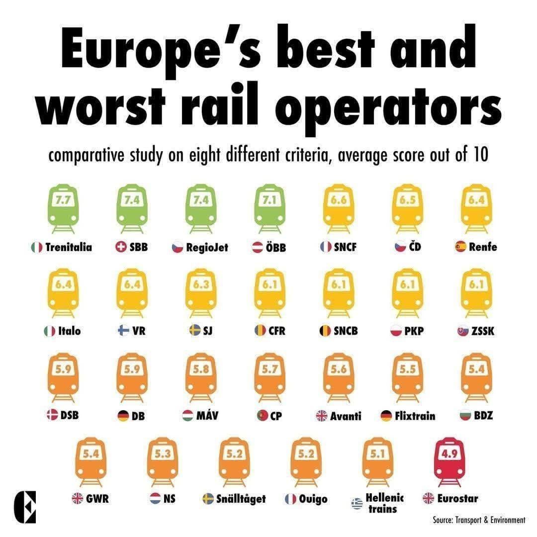 Not sure how this was put together, but NS is far from perfect, but definitely a better operator compared to DB or SNCB.