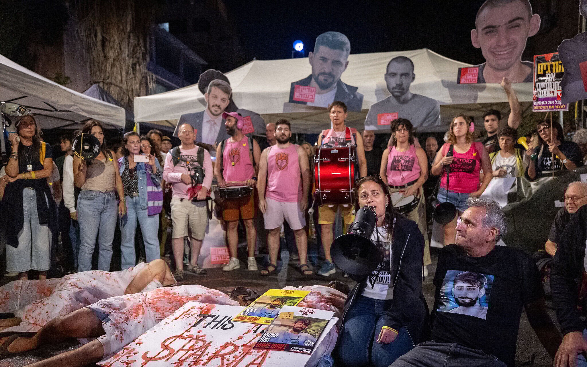 Families of hostages held in Gaza and their supporters protest outside Prime Minister Benjamin Netanyahu’s private residence in Jerusalem, calling for their loved ones’ release, September 17, 2025. (Yonatan Sindel/Flash90)
