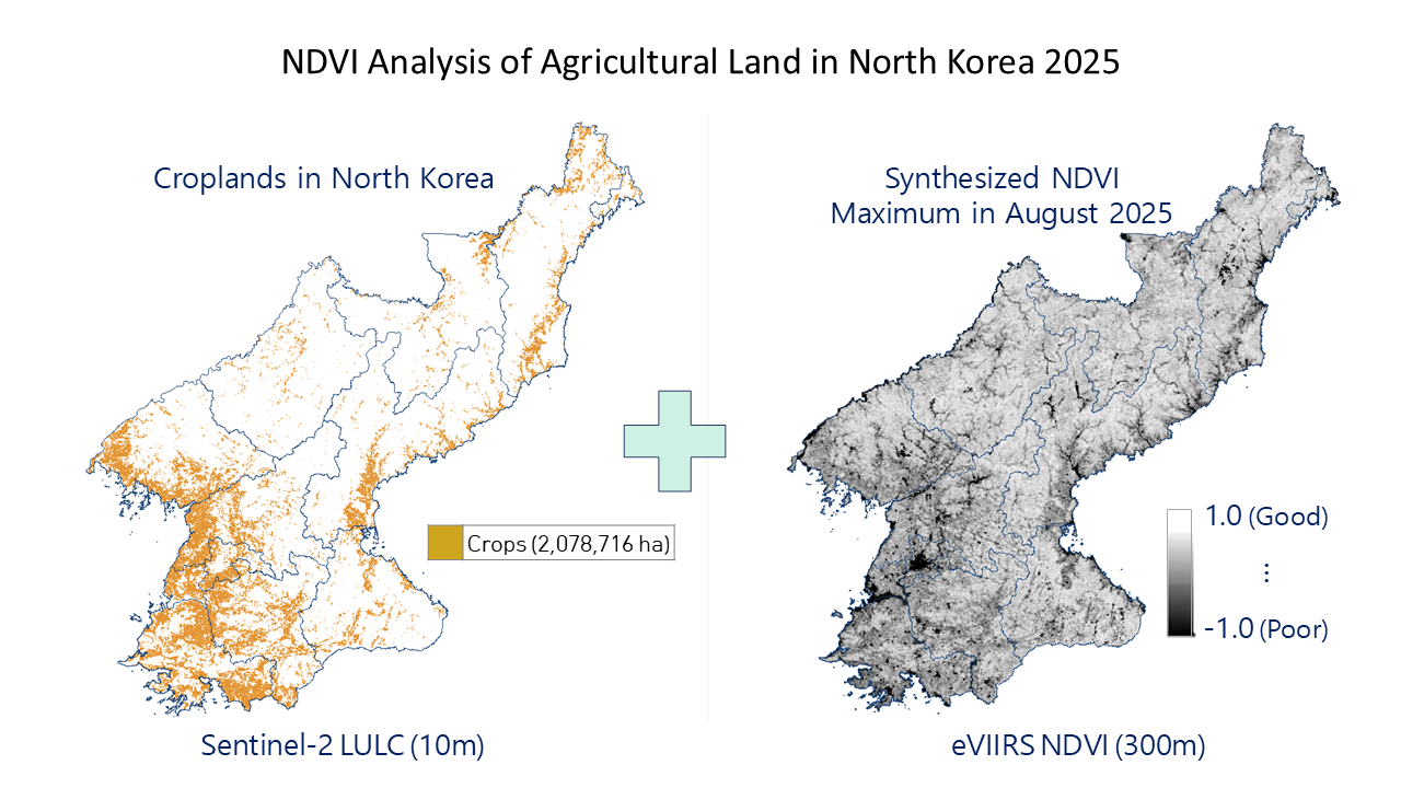 To evaluate North Korea’s 2025 crop growth, I combined farmland distribution maps with Global Vegetation Index imagery. (Sentinel-2 Land Use, eVIIRS NDVI)