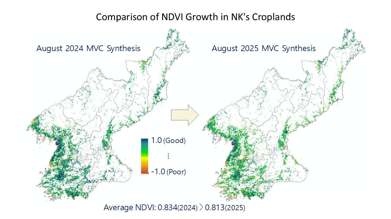 Comparing average vegetation indices for North Korean farmland between August 2024 and August 2025, this year (0.813) showed a decrease of 0.021 compared to last year (0.834). Considering analytical uncertainty, this difference is minimal, and this year’s crop growth appears nearly identical to last year’s.