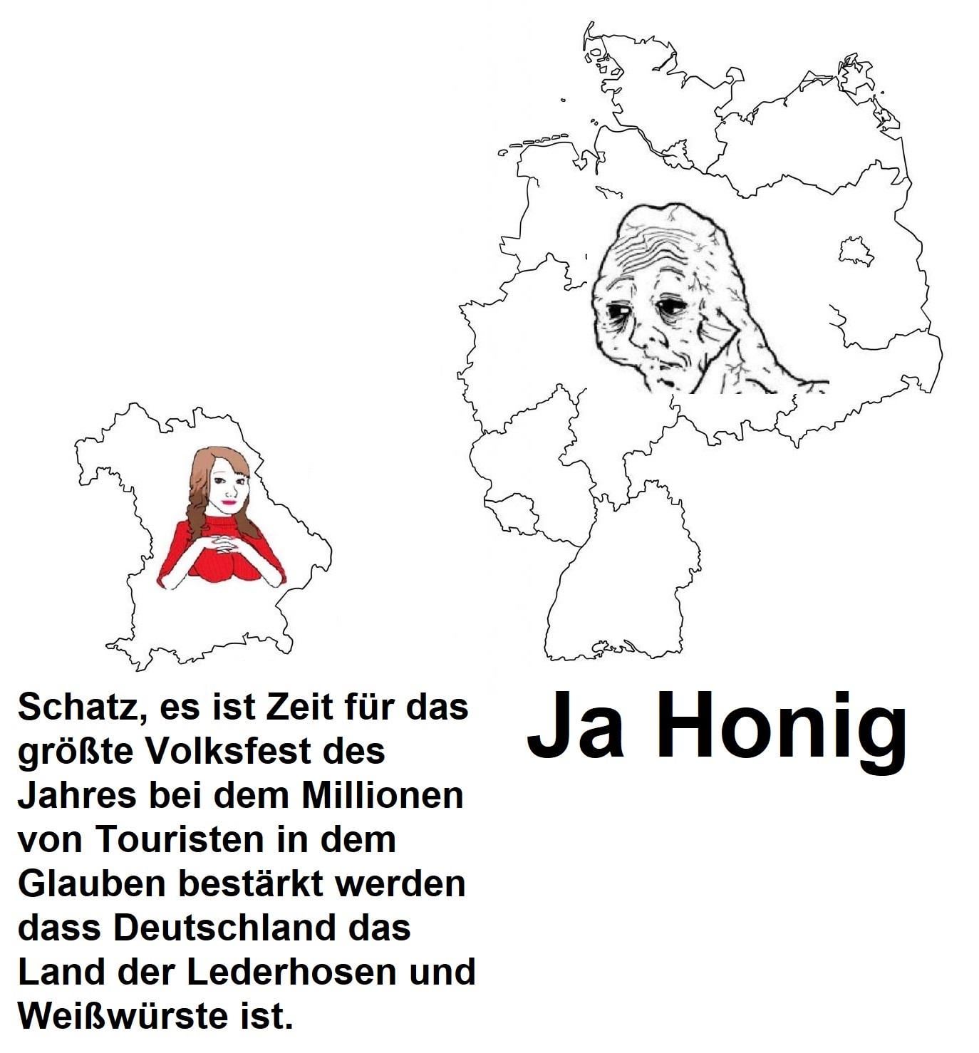 11 Monate Bayern hassen, einen Monat lang Paulaner Oktoberfestbier saufen, und 2€ Discounter-Weißwurst runterschlingen. Faszination Deutschland.