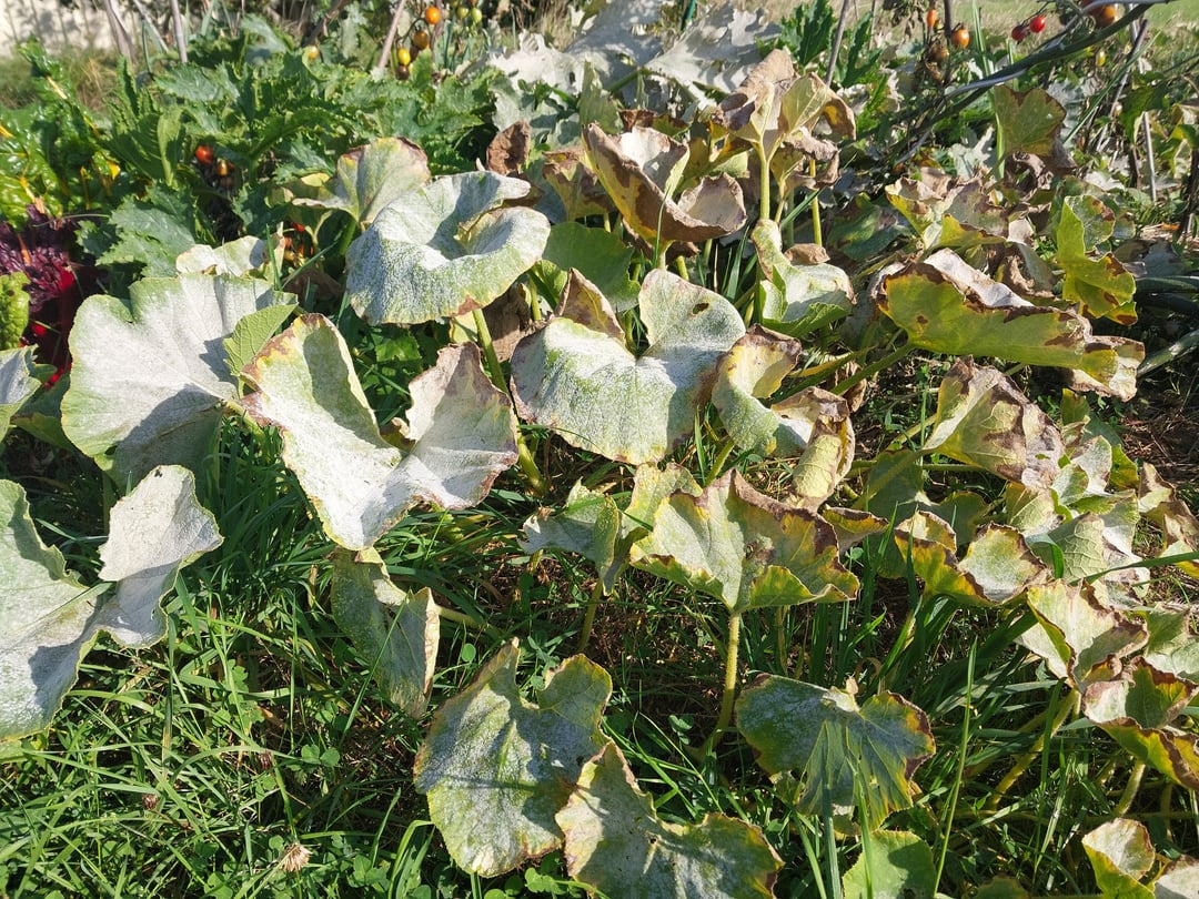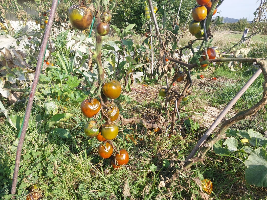 Langsam wird es Zeit, Fläche frei zu bekommen für die herbstliche Bodenbearbeitung, und auch die Botanik fügt sich zunehmend da rein. An den Tomaten greift sichtbar die Braunfäule um sich, inzwischen auch ganz ordentlich an den Früchten, von denen in diesem Jahr leider nur ein Bruchteil reif wird. Aber immer noch um Welten besser als letztes Jahr. Die Kürbisse zeigen ganz ordentlich Mehltau und auch von den Buschbohnen werden die ersten Pflanzen dürr.
