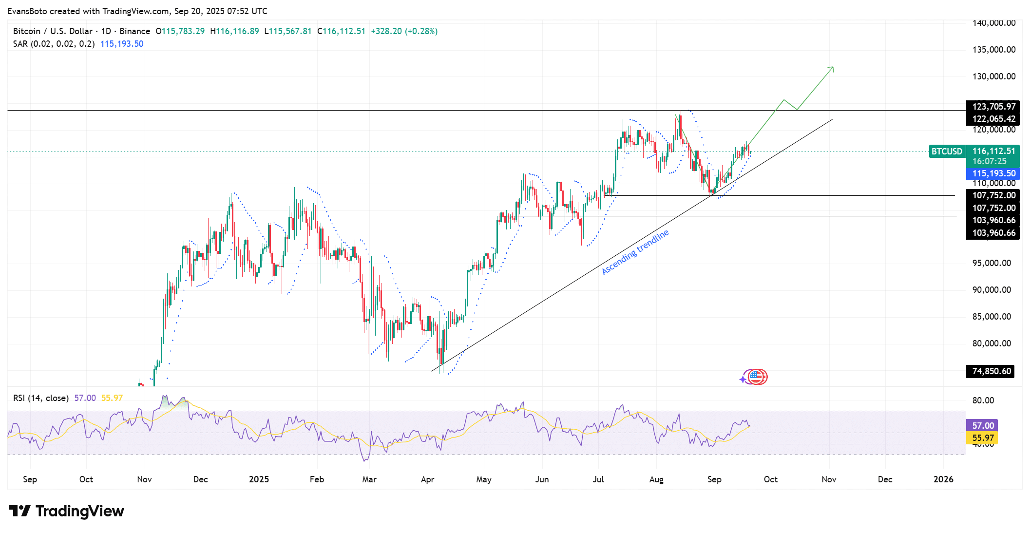 BTC gained 8%, held $116K support, RSI balanced at 57, and Parabolic SAR confirmed bullish continuation despite seasonal weakness.