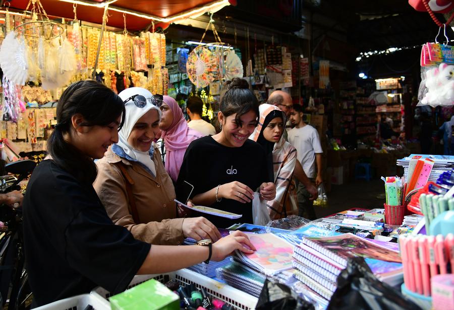 People shop for stationery as the new school year approaches at a market in old Damascus, Syria, Sept. 17, 2025. (Photo by Ammar Safarjalani/Xinhua)