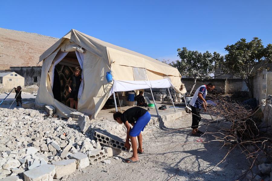 People are pictured near a tent pitched on the rubble in al-Hawash village in Syria’s central Hama province on Aug. 13, 2025. (Str/Xinhua)