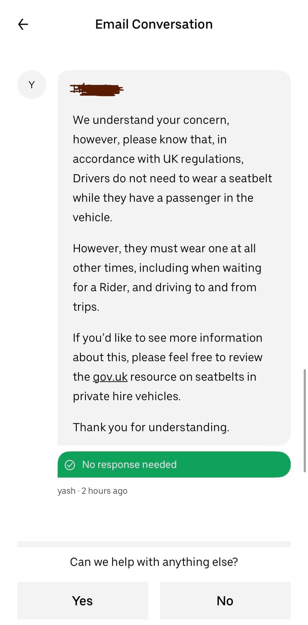 Reported a driver with very bloodshot eyes and who wasn’t wearing his seatbelt (didn’t notice either until the end of the ride) and Uber responded citing UK law.