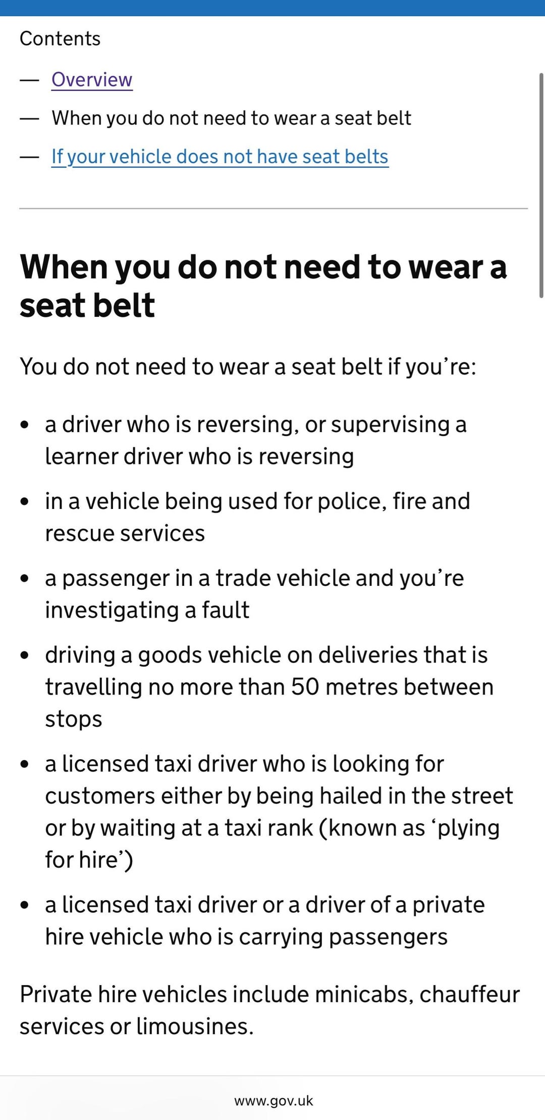 [https://www.gov.uk/seat-belts-law/when-you-dont-need-to-wear-a-seat-belt](https://www.gov.uk/seat-belts-law/when-you-dont-need-to-wear-a-seat-belt)