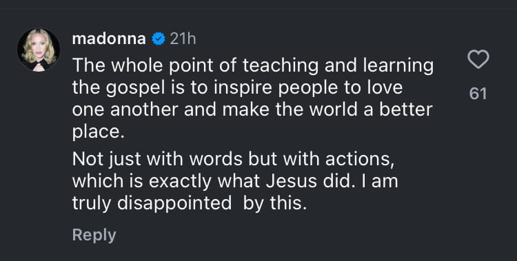 Madonna / Catholic News Agency, Instagram“The whole point of teaching and learning the gospel is to inspire people to love one another and make the world a better place. Not just with words but with actions, which is exactly what Jesus did. I am truly disappointed by this.”