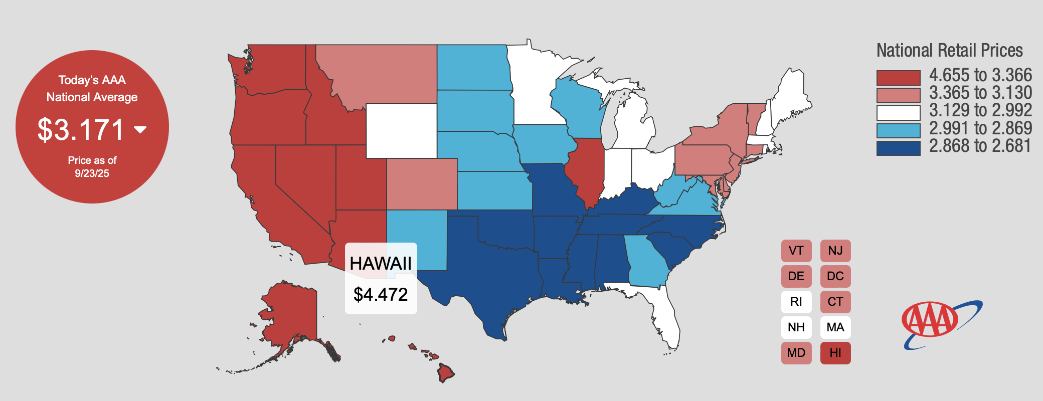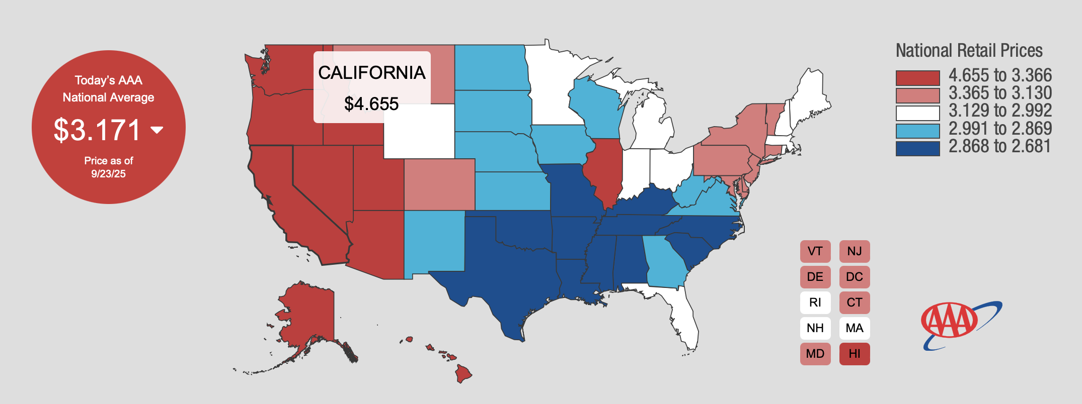 AAA reports today that the national average gas price is $3.17 per gallon. California’s average gas price per gallon is $4.65 – once again, the highest gas price per gallon in the nation.