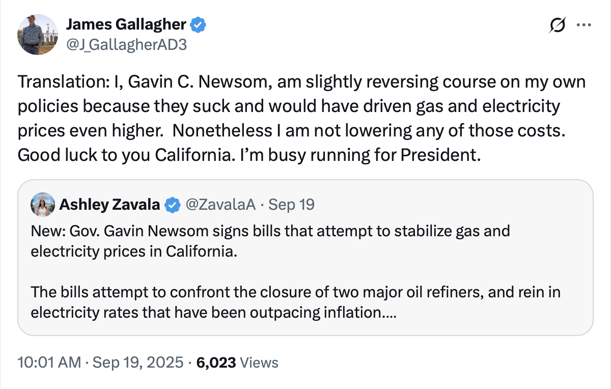“Translation: I, Gavin C. Newsom, am slightly reversing course on my own policies because they suck and would have driven gas and electricity prices even higher,” Assembly Republican leader James Gallagher posted on X. “Nonetheless I am not lowering any of those costs. Good luck to you California. I’m busy running for President.”