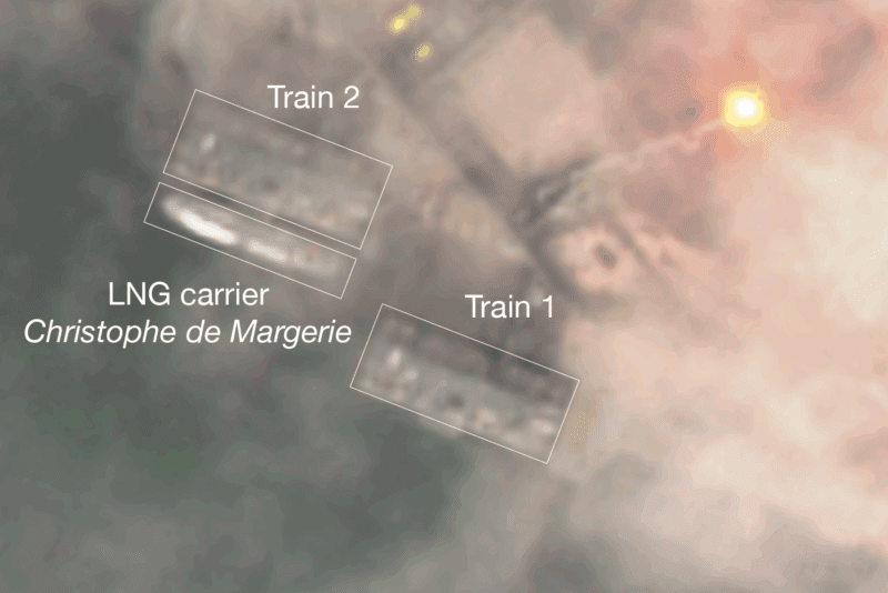 Ice-class LNG carrier Christophe de Margerie, originally built for the neighboring Yamal LNG project, called at the Utrenniy terminal on September 22. Satellite images confirm it berthed alongside Train 2.