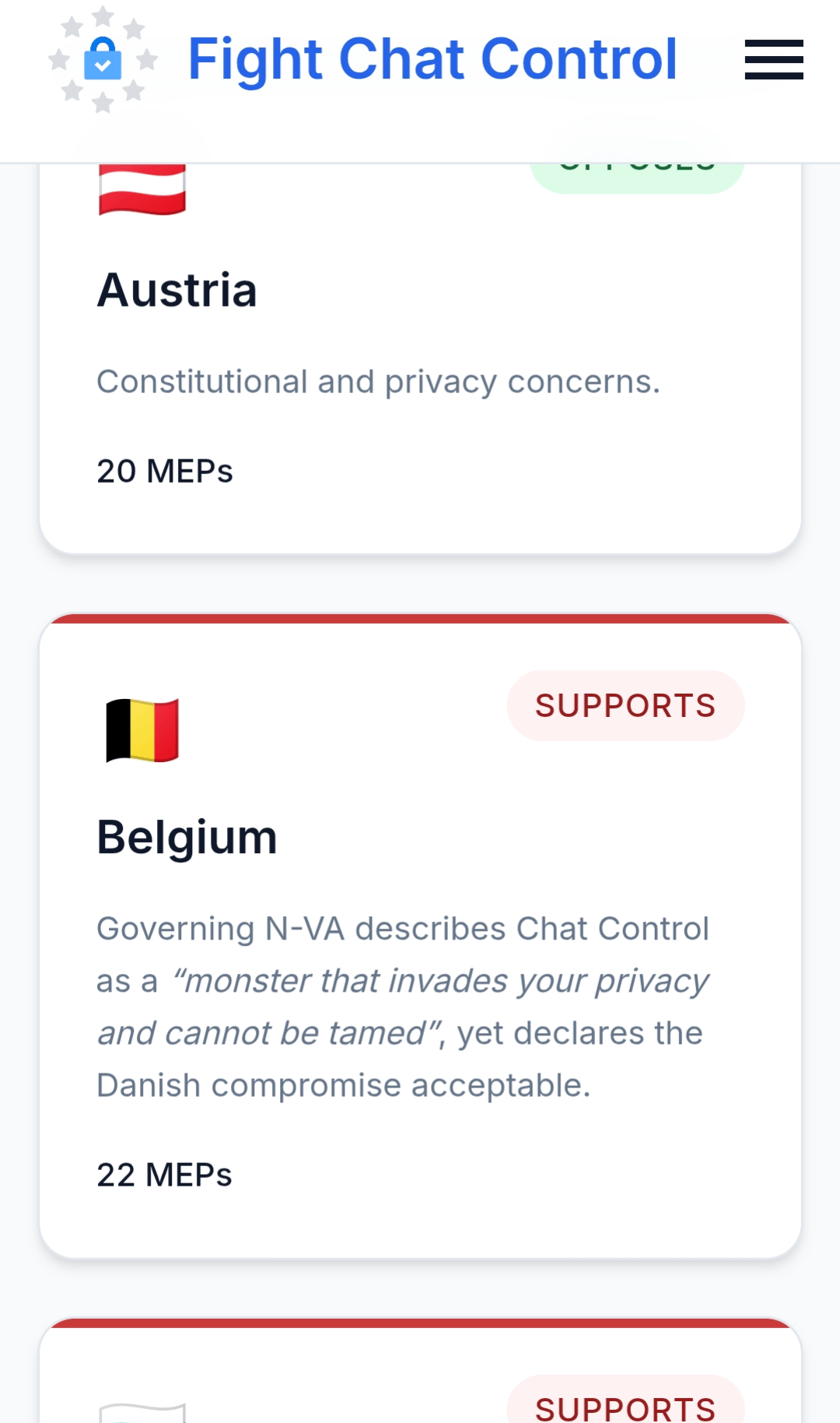 The site lists that 12 of our 22 MEP reps are opposed, and the position of the other 10 is unknown, so I don’t quite understand why it lists the general position of Belgium as ‘supports’? It says the government is in favour, but I can’t find any statements to back that up, and in the end it’s the MEPs who vote, no?