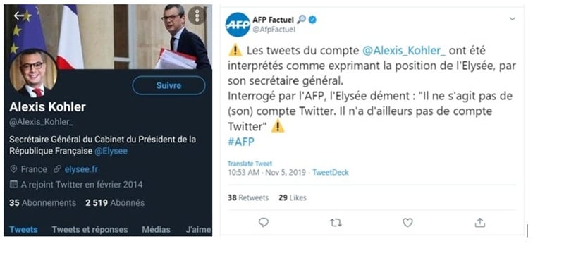 The regime’s manipulation is not limited to whispers in parliamentary corridors or planted op-eds. In November 2019, the MOIS even fabricated a Twitter account impersonating Alexis Kohler, the Secretary-General of the French presidency. The account falsely claimed that France was about to expel the MEK. The day after, the Elysee Palace denied this statement, adding that this Twitter account did not belong to Alexis Kohler and that the senior official did not even have a Twitter account.
