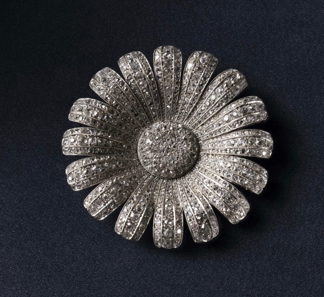 In 1935, Crown Prince Gustaf Adolf of Sweden commissioned a brooch in the shape of a Daisy as a wedding gift for his only daughter, Princess Ingrid, when she married the future King Frederik IX of Denmark. The diamonds in the Brooch came from his late wife, Crown Princess Margareta, and the design echoed her nickname ‘Daisy’, which is also the national flower of Denmark.