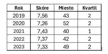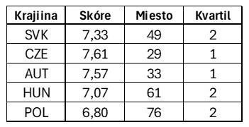 Slovensko je lepšie ako Maďarsko (61. miesto, 7,07) a Poľsko (76. miesto, 6,80), ale zaostáva za Českom (29. miesto, 7,61) a Rakúskom (33. miesto, 7,57). Zaostáva aj za priemerom EÚ a to najmä kvôli krajinám ako je Írsko, Dánsko či Holandsko, ktoré sa nachádzajú v prvej desiatke najlepších krajín sveta.