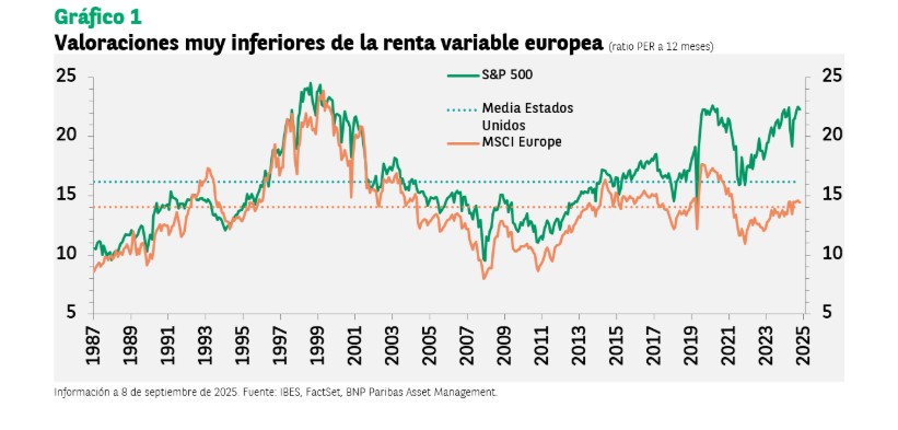 “In our view, attractive valuations make a strong case for European equities: they are currently trading at a substantial discount compared to the U.S. market. The twelve-month forward price-to-earnings ratio of the MSCI Europe index is currently at 14.6, slightly above its average since 1980, which is 14. By contrast, in the United States, valuations are approaching historic highs, with an expected earnings ratio of 22 times. In addition, the average dividend yield in Europe is approaching 3.3%, which far exceeds the U.S. average of around 1.3%,” argues BNP Paribas AM.