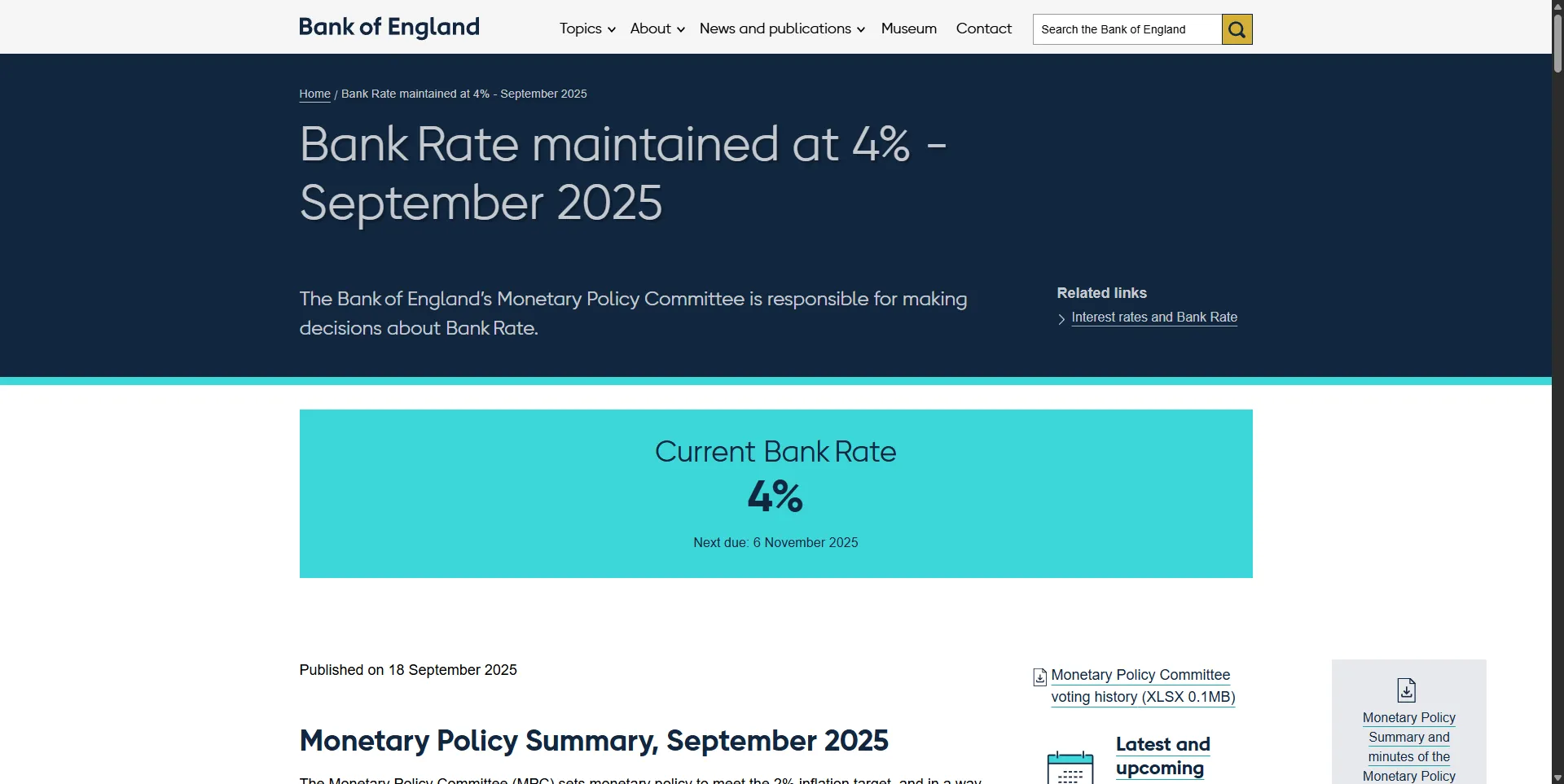 Inflation in the UK remains elevated at around 3.8%, nearly twice the BoE’s 2% target. This stickiness has forced policymakers into a delicate balancing act. At its most recent meeting, the BoE opted to hold interest rates at 4.00%, signaling caution about cutting too quickly while acknowledging risks of stalling growth.