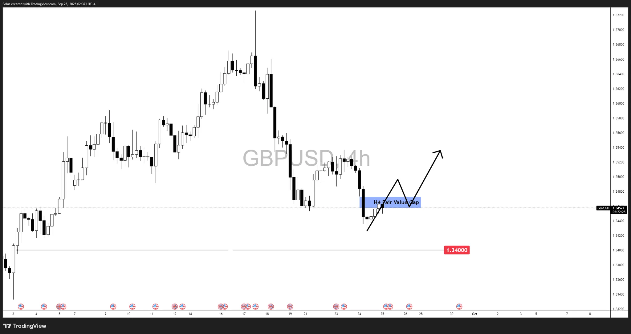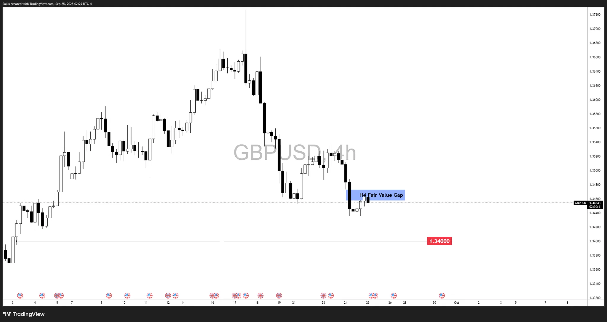 Failure to clear the 1.34575–1.34732 FVG would likely reinforce bearish momentum. In this case, sellers may drive price back down toward 1.3400, the next key support and liquidity target. A breakdown below 1.3400 would open the door to a deeper slide, potentially testing the 1.3300 handle in the coming sessions.