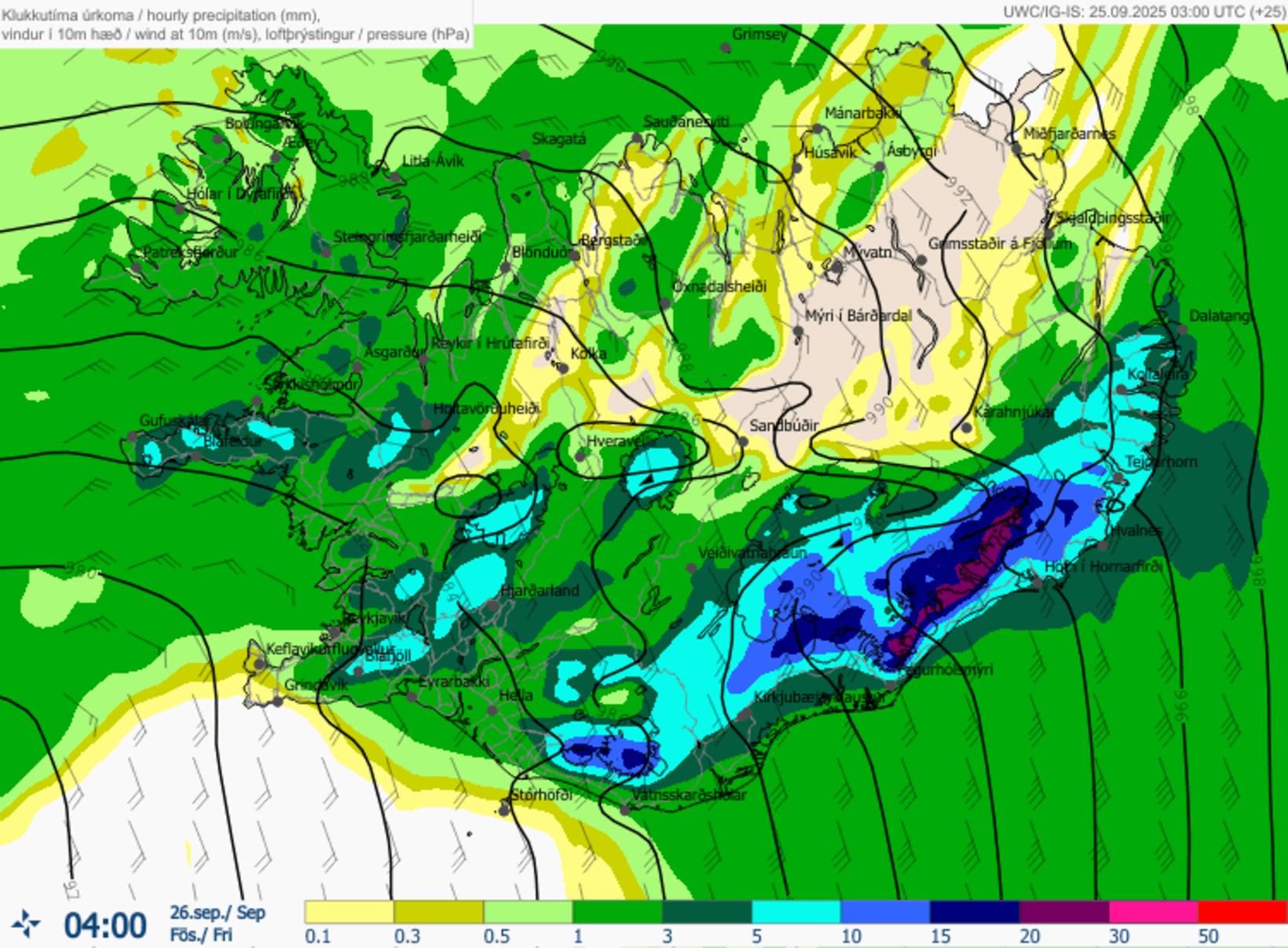 “The heaviest rainfall is expected in South and Southeast Iceland and the southern Eastfjords, with rates exceeding 25 mm per hour in mountainous and glacial areas, and around 10 mm per hour in lowlands,” the warning states.
