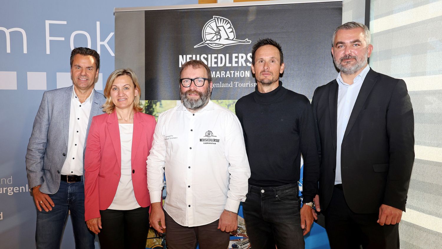 Foto von der Präsentation der WM-Bewerbung, v.l.n.r.: Didi Tunkel (GF Burgenland Tourismus), Bettina Zentgraf (Bürgermeisterin Mörbisch), OK-Chef Hannes Hessenberger, Ex-Radprofi Johnny Hoogerland, Sportlandesrat Heinrich Dorner (c) Landesmedienservice Burgenland