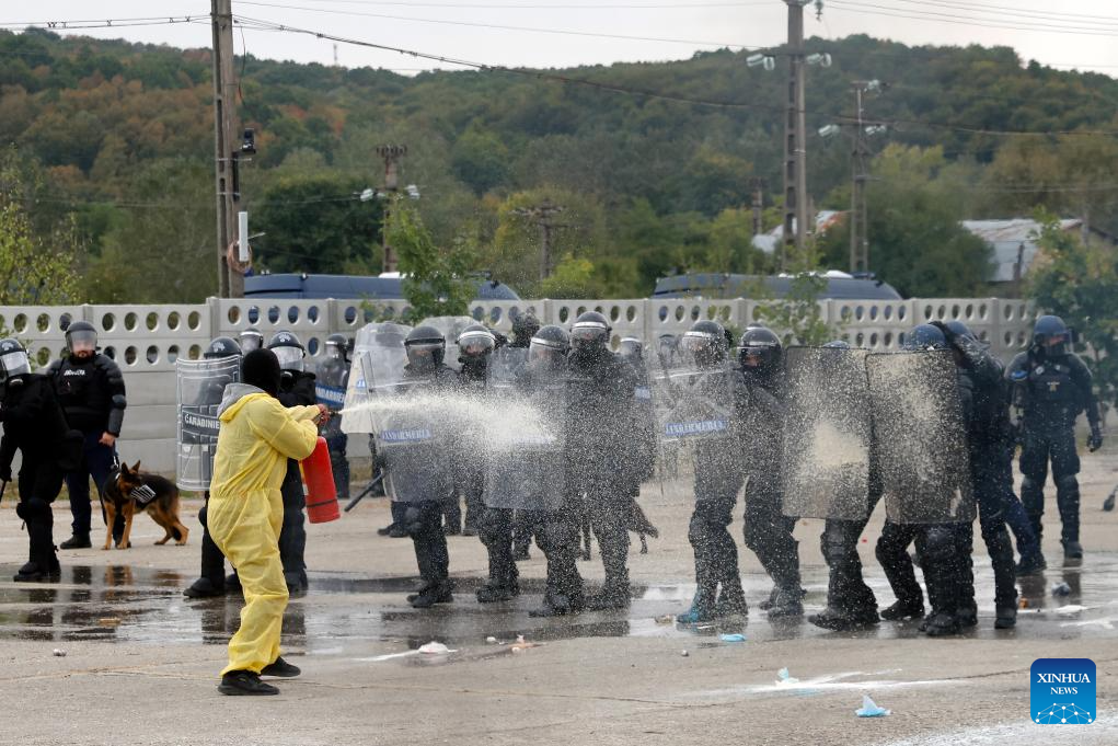 A fake protester confronts with Romanian riot policemen during the “Carpathian Blue Shield 2025” international exercise at the Gendarmerie Training Center in Ochiuri village, north of Bucharest, Romania, Sept. 25, 2025. Over 500 riot policemen from Romania and other European countries participated at the drill. (Photo by Cristian Cristel/Xinhua)