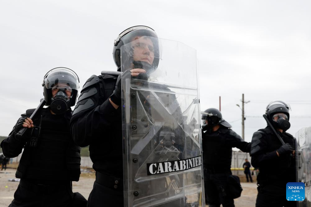 Italian riot policemen participate at the “Carpathian Blue Shield 2025” international exercise at the Gendarmerie Training Center in Ochiuri village, north of Bucharest, Romania, Sept. 25, 2025. Over 500 riot policemen from Romania and other European countries participated at the drill. (Photo by Cristian Cristel/Xinhua)