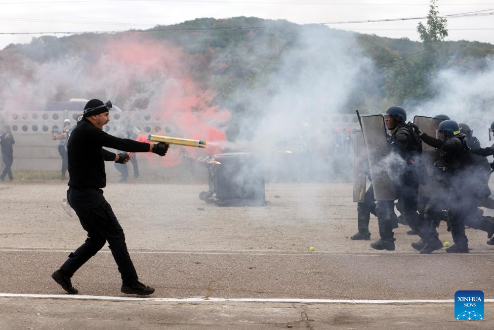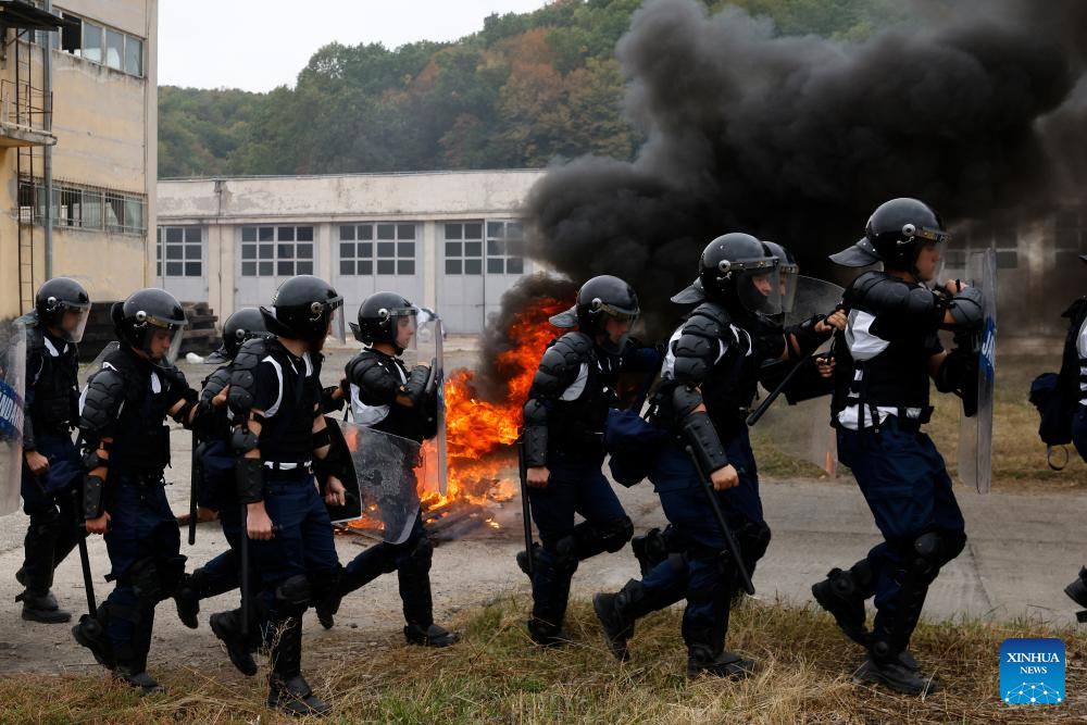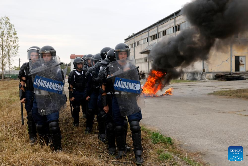 Romanian riot policemen participate at the “Carpathian Blue Shield 2025” international exercise at the Gendarmerie Training Center in Ochiuri village, north of Bucharest, Romania, Sept. 25, 2025. Over 500 riot policemen from Romania and other European countries participated at the drill. (Photo by Cristian Cristel/Xinhua)