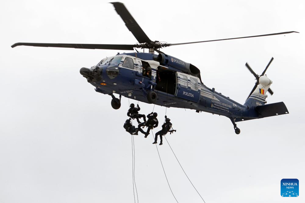 Romanian riot policemen descend from a helicopter during the “Carpathian Blue Shield 2025” international exercise at the Gendarmerie Training Center in Ochiuri village, north of Bucharest, Romania, Sept. 25, 2025. Over 500 riot policemen from Romania and other European countries participated at the drill. (Photo by Cristian Cristel/Xinhua)