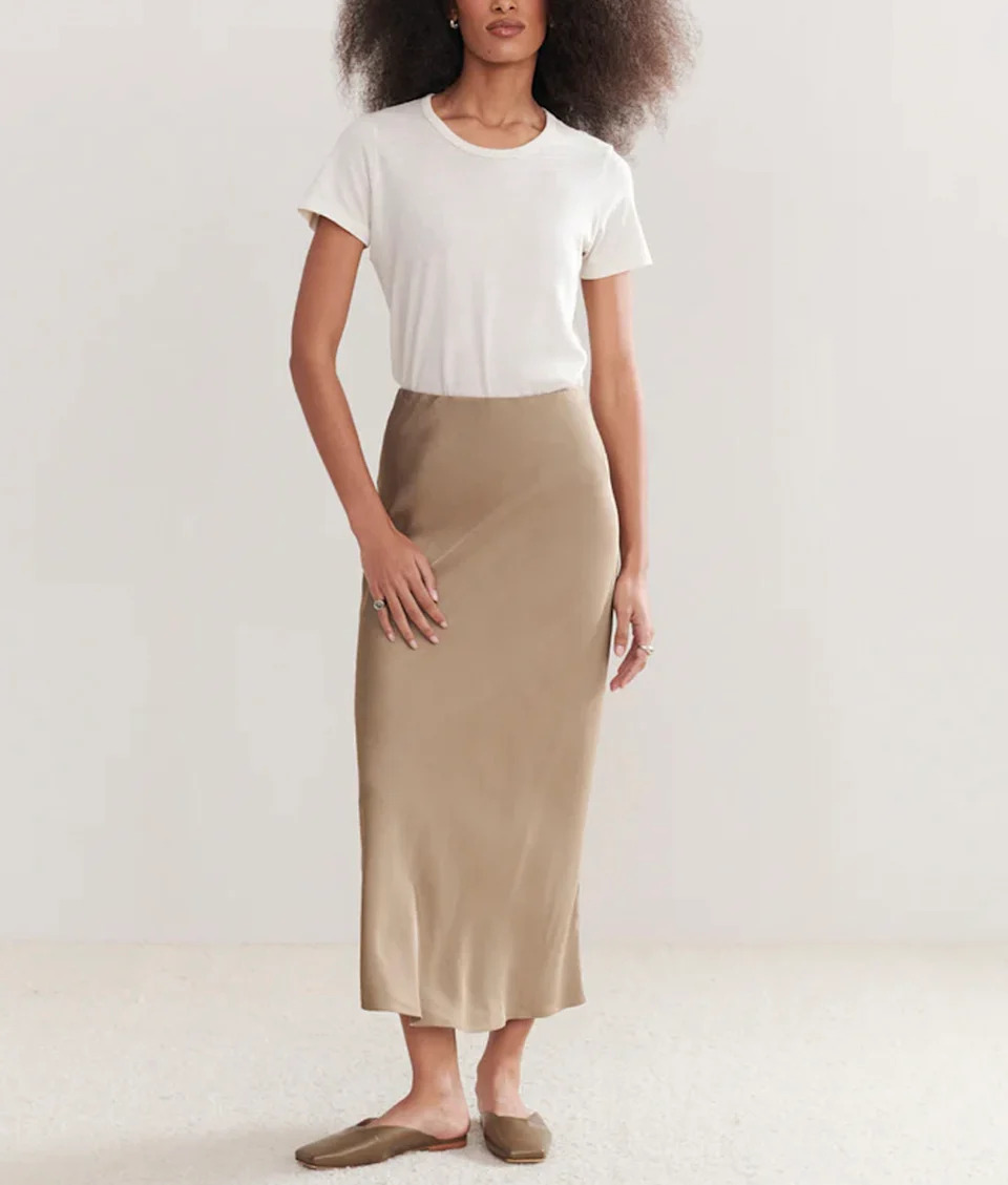 The princess opted to pair a shimmery silk skirt in a taupe hue with a cardigan sweater in the same color. Together, the monochromatic styles looked elegant, but also helped Eugenie stand a little taller. (Exactly the combination you want when you’ve got a bold message to share.)
