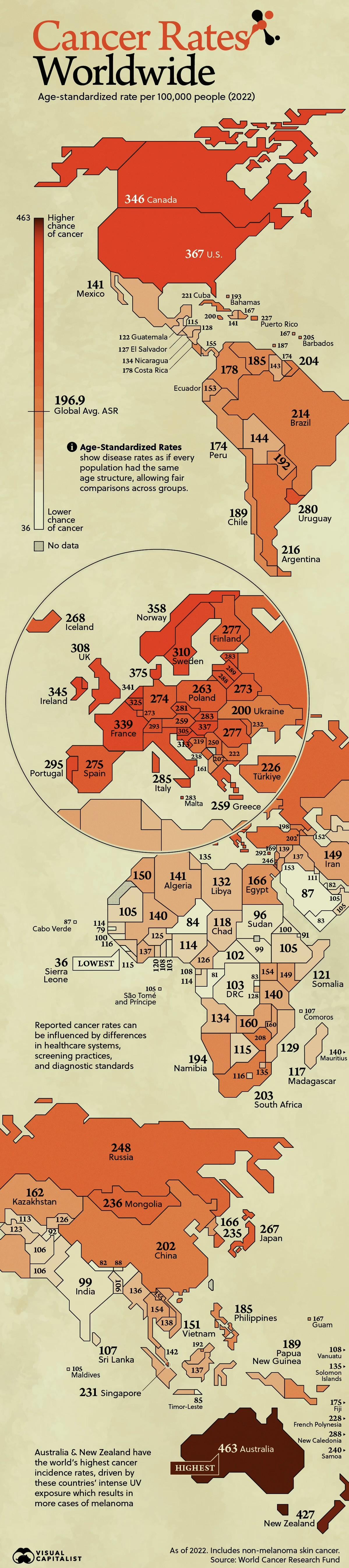 You have high cancer rates because you detect it more. Everyone else in the world dies of “natural causes” while you have a bunch more cancer survivors.