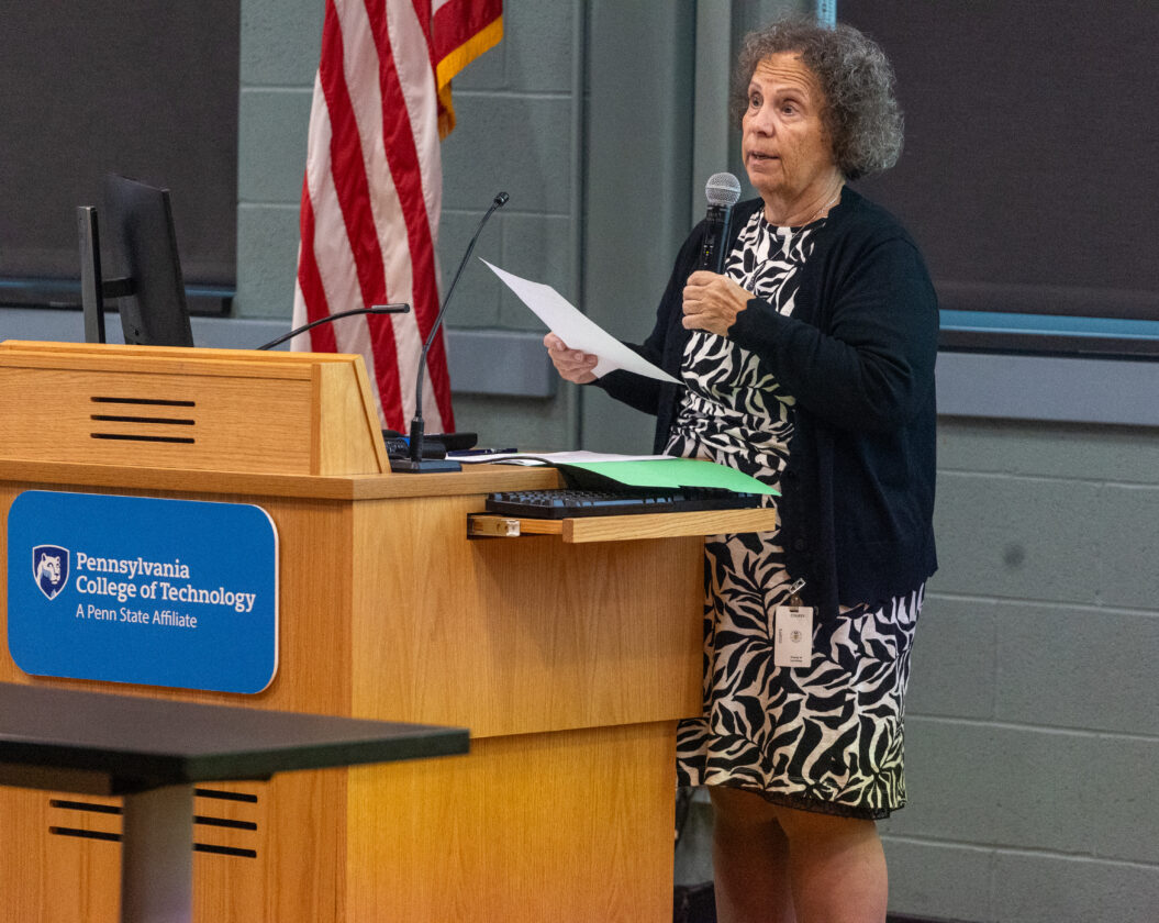 President Judge Nancy Butts speaks to the crowd during the Path to Empowerment Workshops. The event, hosted by GEO and Lycoming County Reentry Coalition provided re-entrants with the skills needed to secure employment, better represent themselves during the hiring process and retain employment.