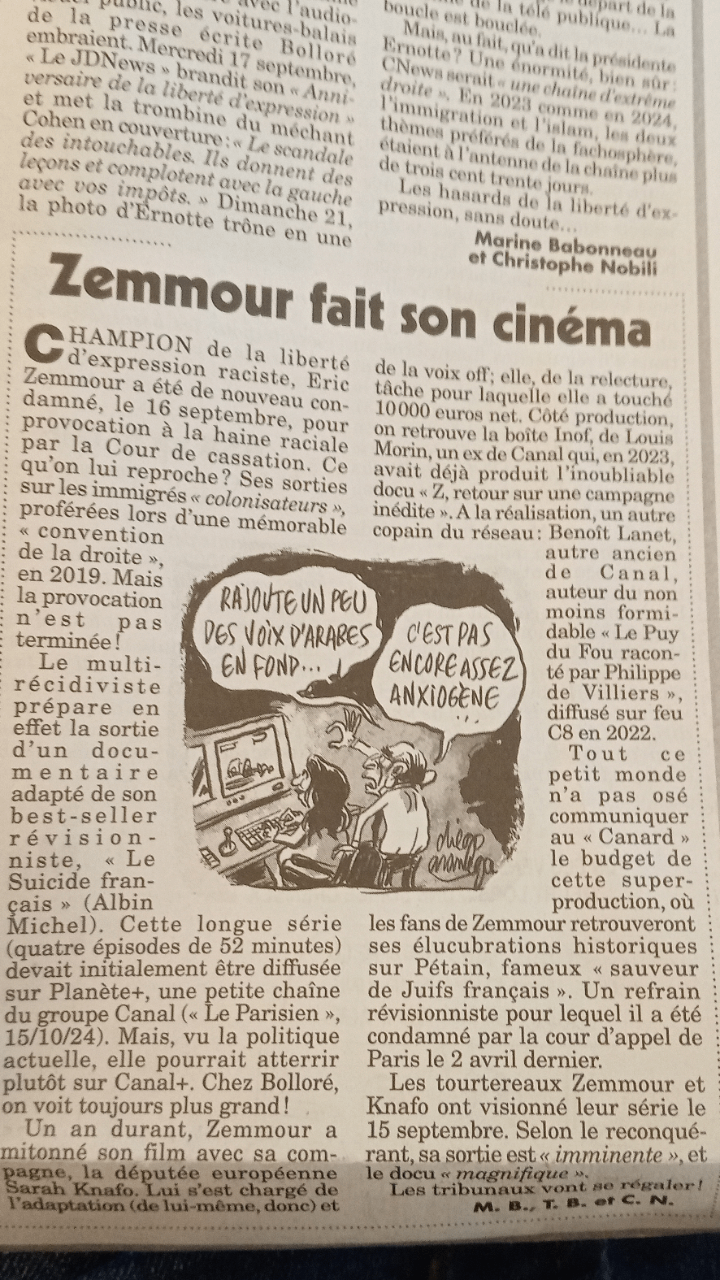 Zemmour fait son cinéma (le canard enchaîné 24/09/25) by Additional_Bug_7876 Tags:ActualitésfranceL actualité au quotidienL'actualité au quotidien 1 comment C’est triste de voir un homme de cet âge ne pas réussir à faire le deuil de son pays natal. Comments are closed.