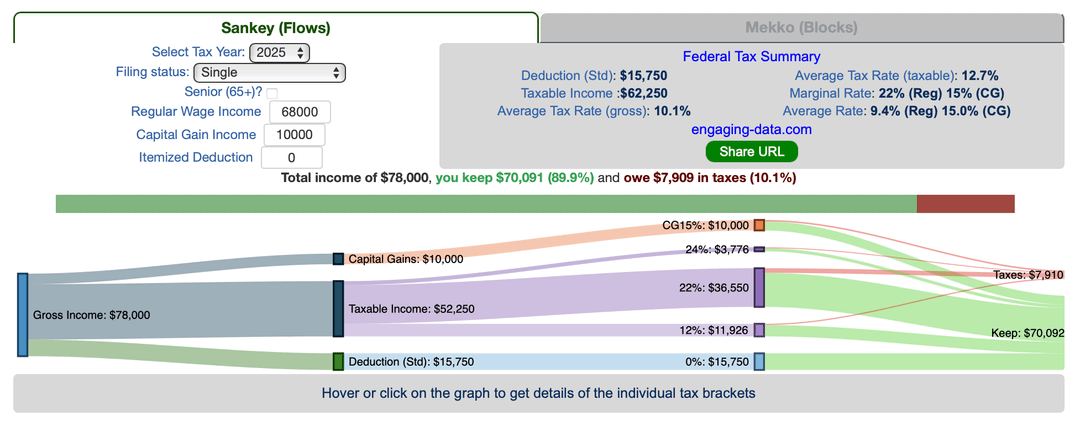 I know many folks have some misunderstandings about how tax brackets work so these graphs can help with showing how the US federal tax brackets work. I added a Mekko graph to the Sankey graph to give a different way to visualize the tax brackets. Also updated the calculations to include the latest tax changes from the 2025 bill, which raises the standard deduction and adds an additional senior deduction.