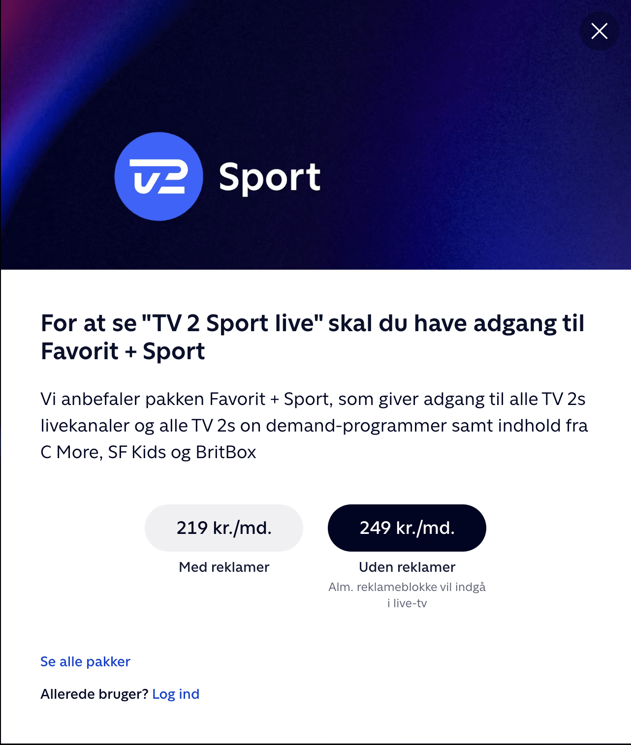 Indtil jeg så at der, under alt det der står med stort på abonnements siden, står noget med småt der hedder Live hvor jeg kan vælge én kanal for 69 kr eller to for 99 kr. jamen ja tak!