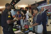 Mimi Geli, right, looks at jobs available at the Seminole Police Department during an Aug. 28 job fair in Sunrise, Fla.