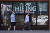 Pedestrians walk by a “Now hiring” sign Aug. 28 at an electronics store in Dallas.
