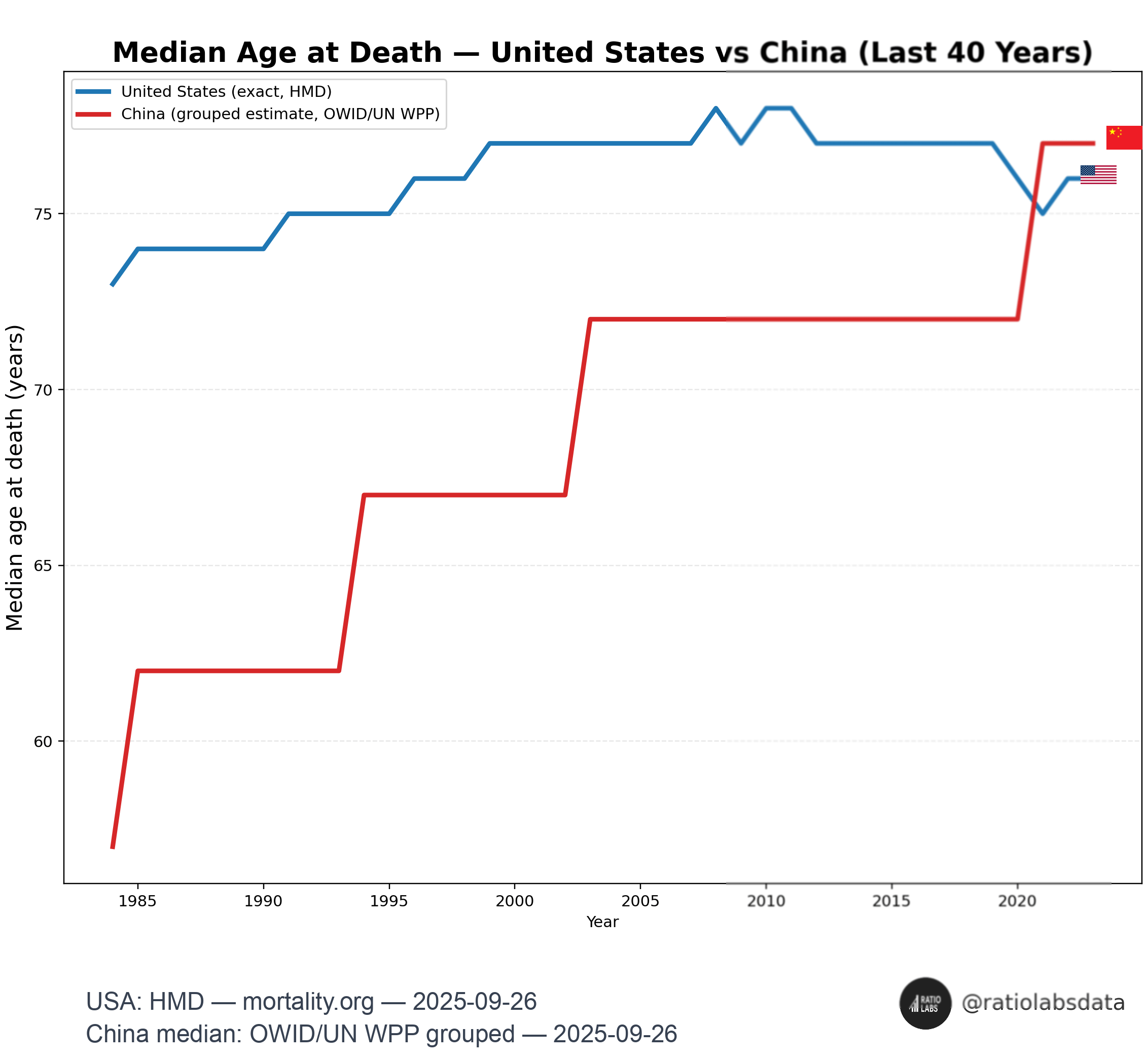 Source: USA: HMD — [mortality.org](http://mortality.org); China median: OWID/UN WPP grouped, made with seaborn