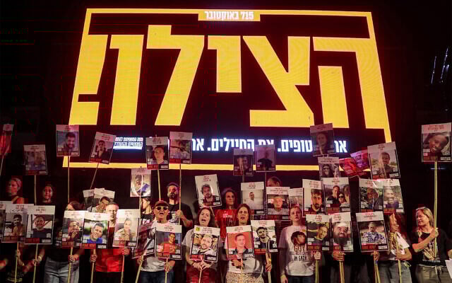Israelis rally for the release of captives held by Hamas-led terrorists in Gaza, at Hostage Square in Tel Aviv on September 20, 2025. (Jack Guez/AFP)