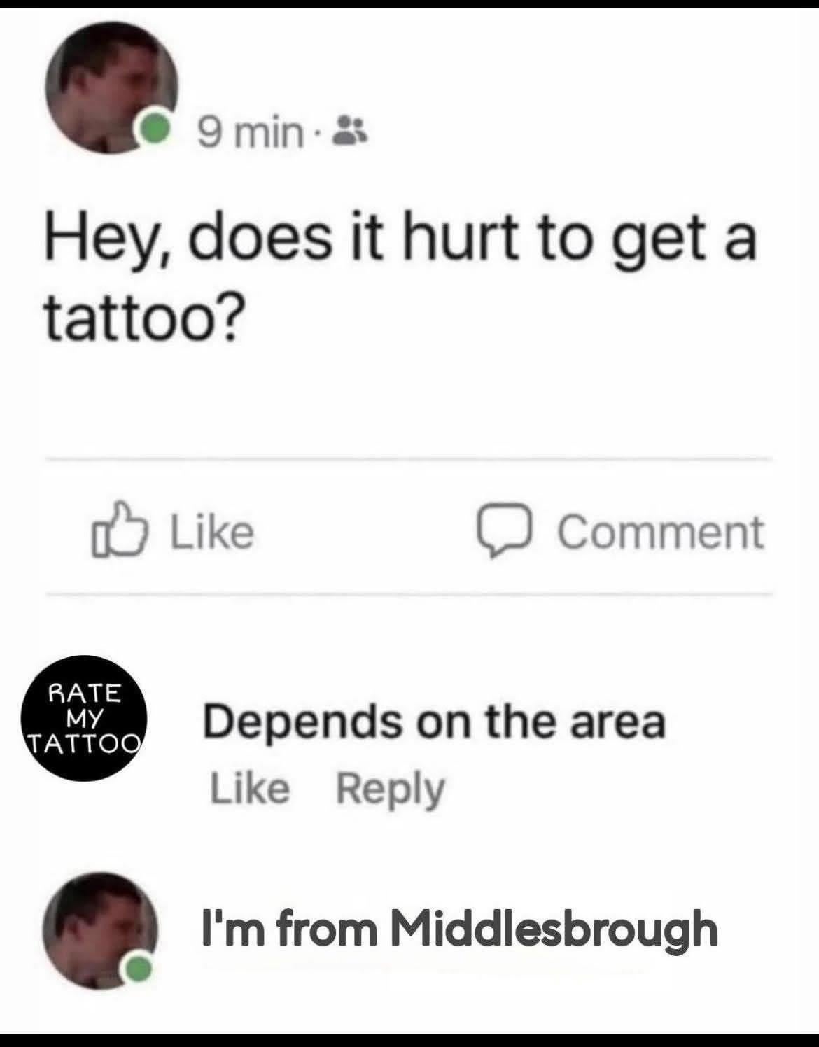 Middlesbough? You’re in luck! That’s the least painful spot! Go for a big one on the ribs, my friend!