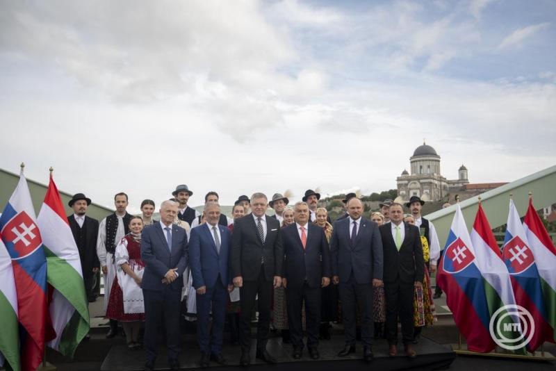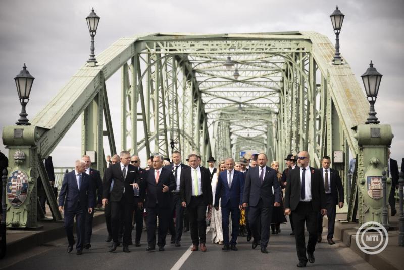 A Miniszterelnöki Kommunikációs Főosztály által közreadott képen Orbán Viktor miniszterelnök (első sor, j3) és Robert Fico szlovák kormányfő (első sor, b3) az Esztergomot és Párkányt összekötő Mária Valéria hídon az átadása 130. évfordulóján rendezett ünnepségen 2025. szeptember 28-án.