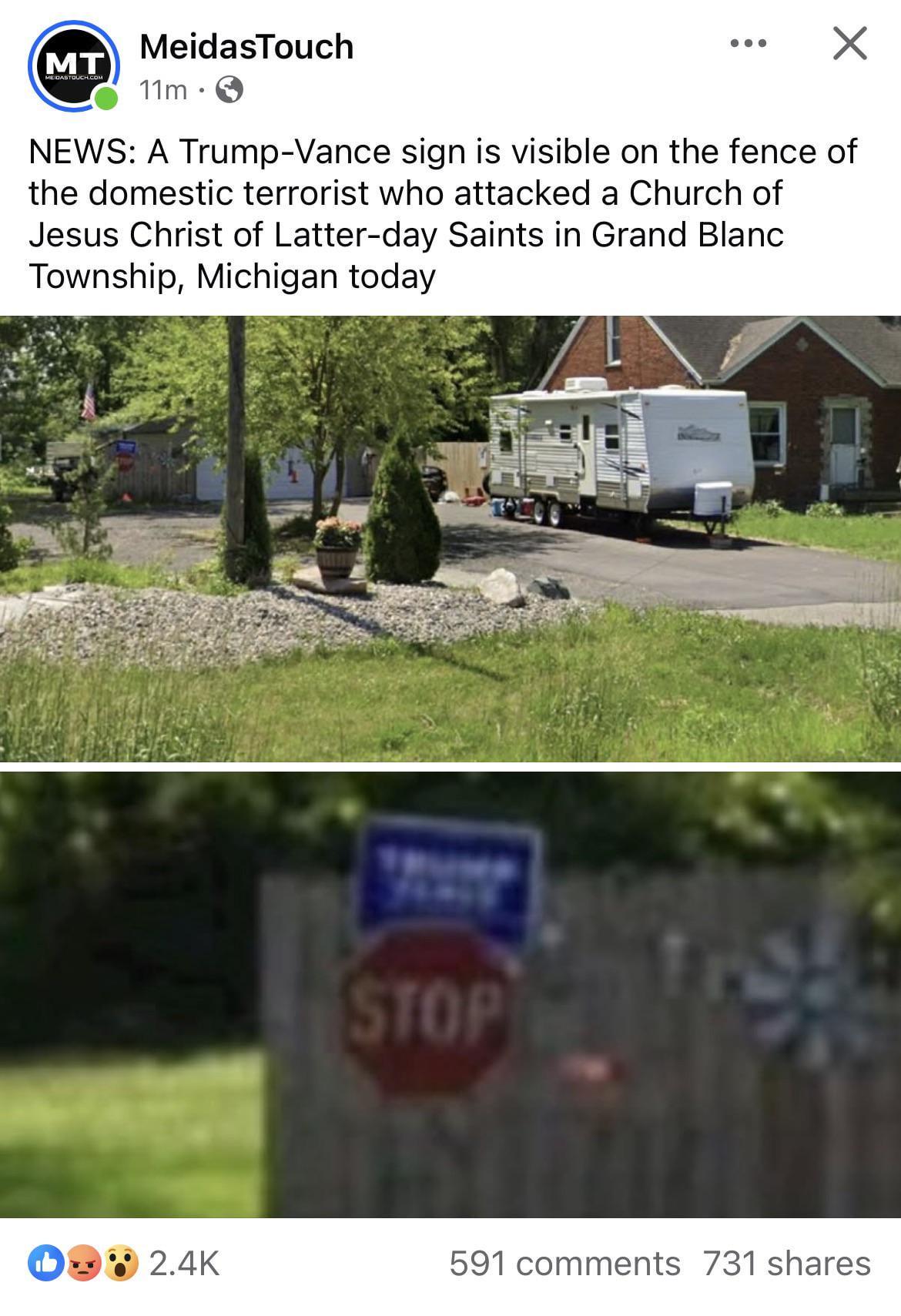 A Trump-Vance sign is visible on the fence of the domestic terrorist who attacked a Church of Jesus Christ of Latter-day Saints in Grand Blanc Township, Michigan today