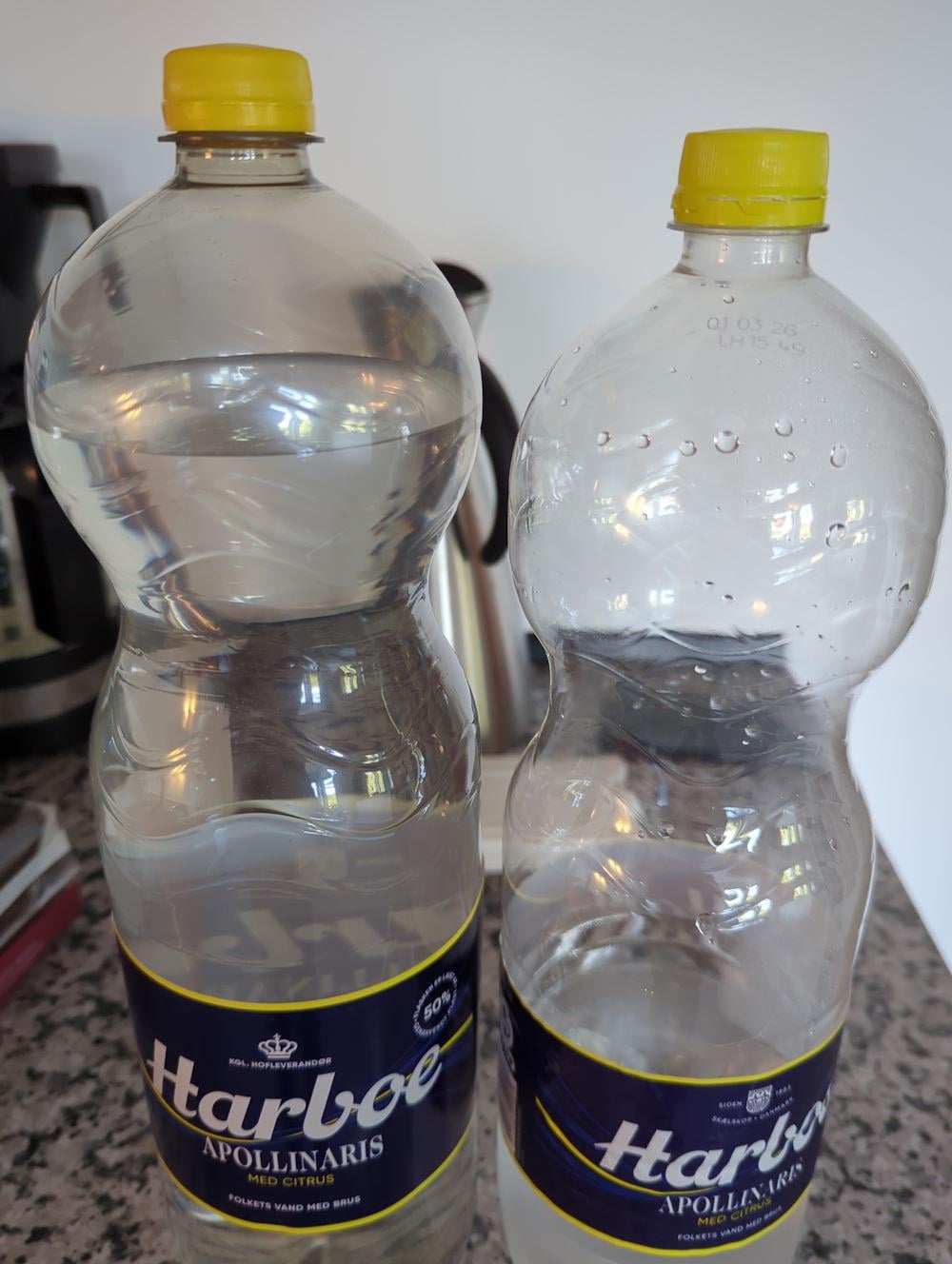 Jeg har bemærket, at 2-liters flaskerne med Harboe Apollinaris, som jeg jævnligt køber, er blevet 2-3 cm højere, på trods af at mængden af danskvand i flaskerne er fuldstændig den samme – netop 2 liter.