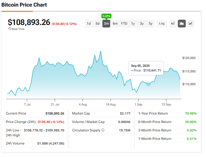 Most analysts don’t offer ratings or price targets on Bitcoin. So instead, we’ll look at the three-month performance of BTC. As one can see in the chart below, the price of Bitcoin has risen 5.02% in the last 12 weeks.