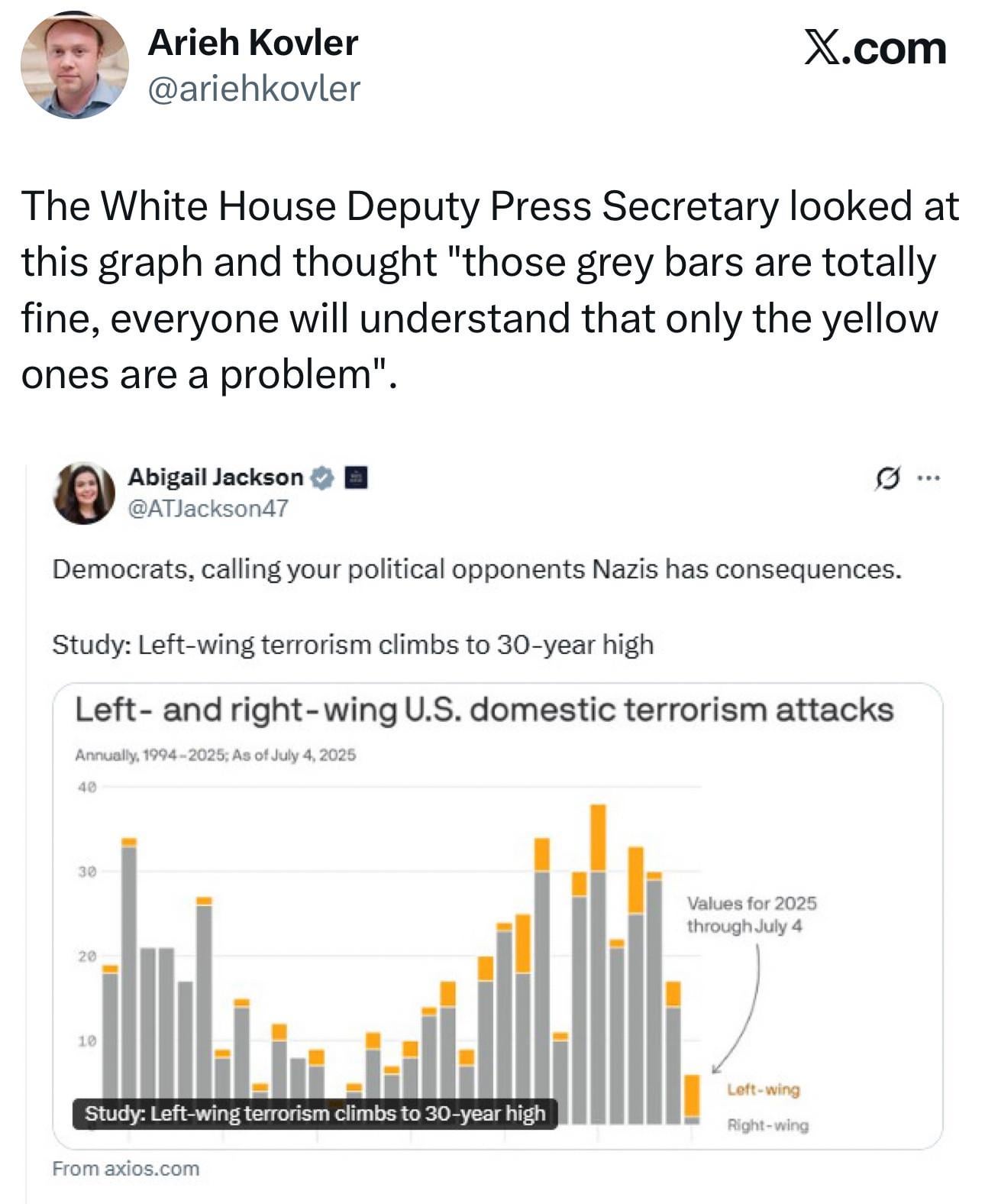 Also conveniently leaving out that they, the fascists, deliberately stopped tracking right-wing terrorism as soon as they got into power. So yeah, it’s skewed when they just stopped counting the 2025 right-wing terror plots, in addition to declaring various random instances as ‘left-wing’ when they weren’t. They are the most dishonest cretins imaginable.